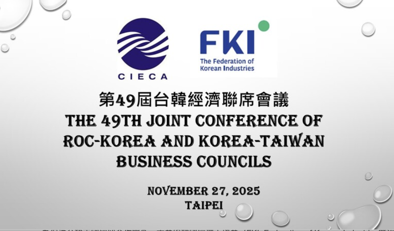 本屆會議由 中華民國國際經濟合作協會(CIECA) 與 韓國經濟人協會(FKI) 共同主辦,邀集兩國產官學界領袖齊聚台北,聚焦AI時代下的產業轉型與永續發展。